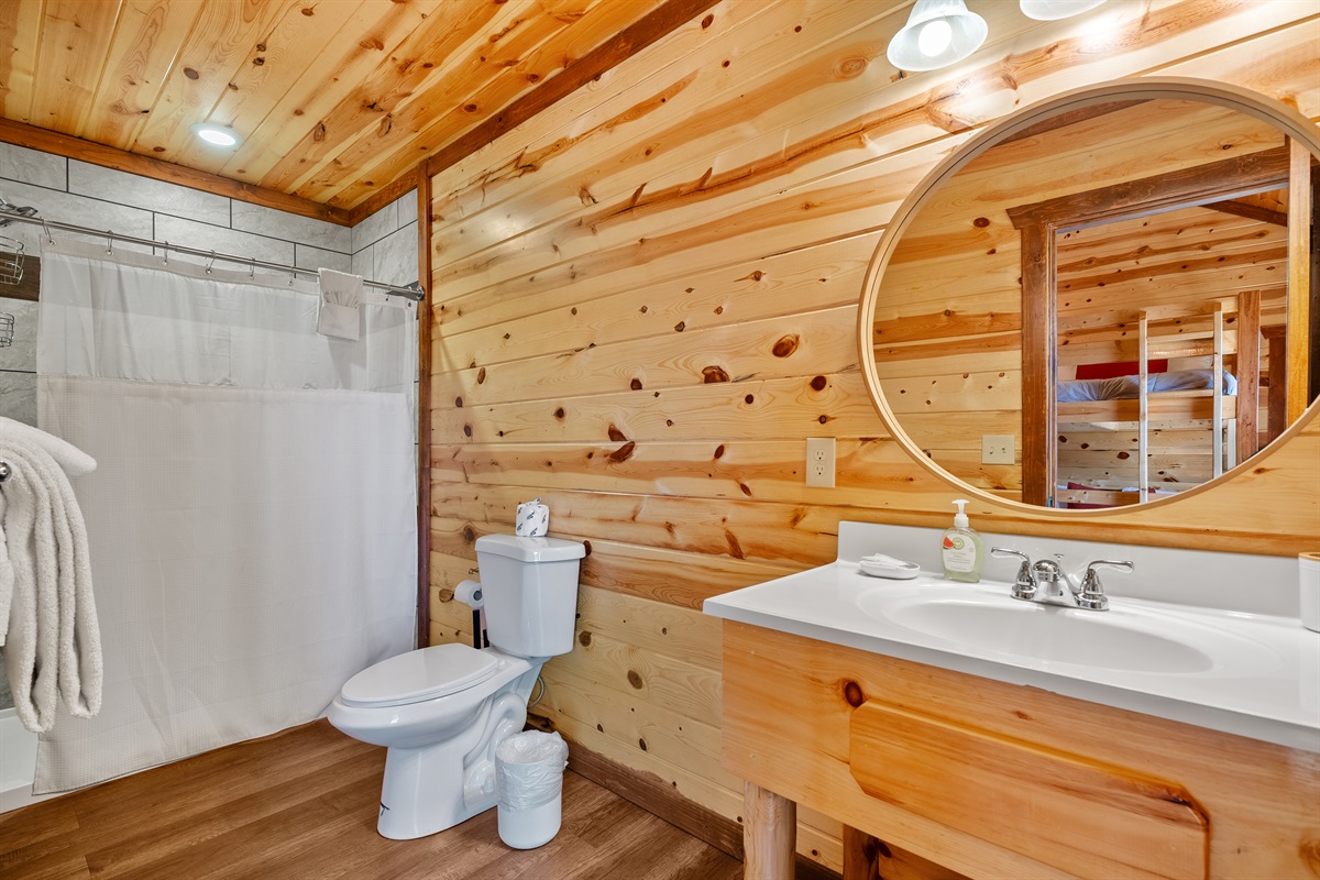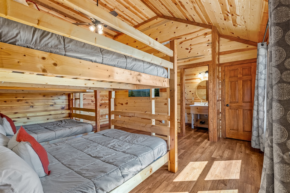 - Bunk Bedroom is located upstairs and features 2 full over full bunk beds sleeping up to 8 total guests, a TV, and a full ensuite bath.