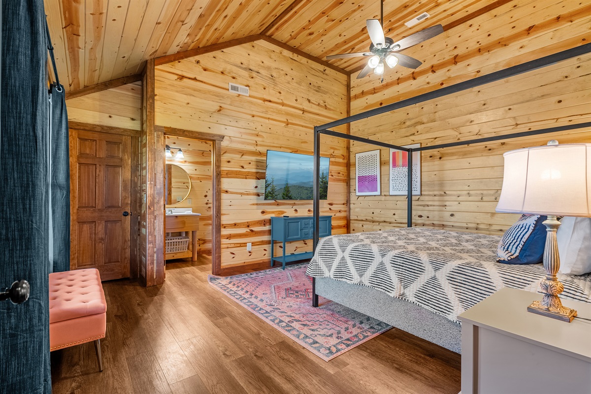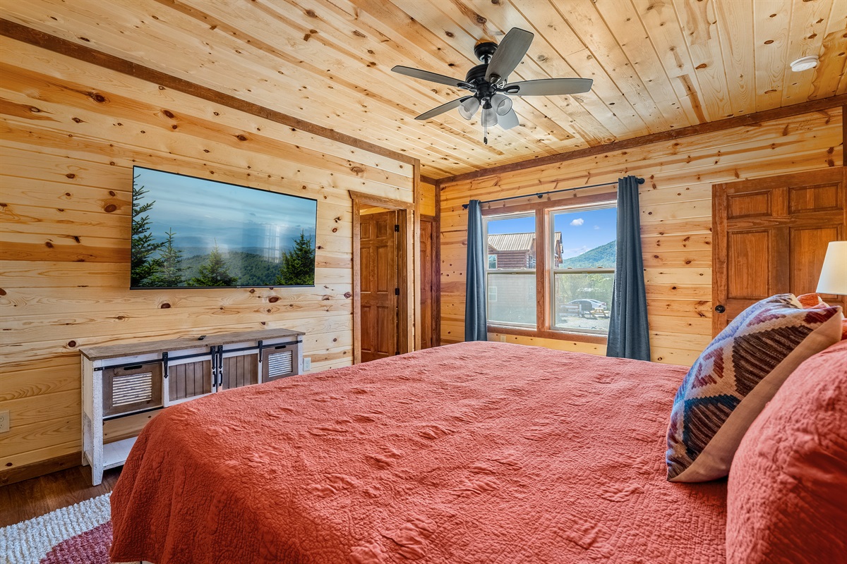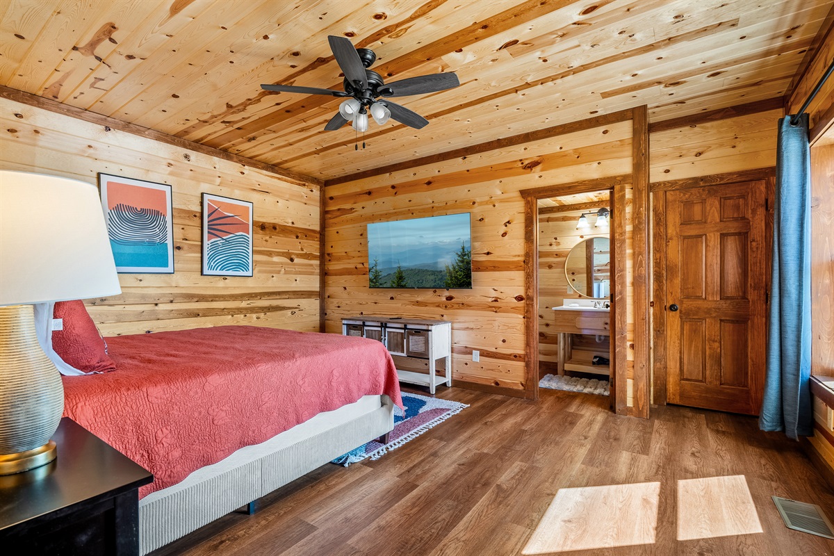 - King bedroom 2 is located on the main level and includes a king bed, ceiling fan, TV, and full ensuite bathroom.
