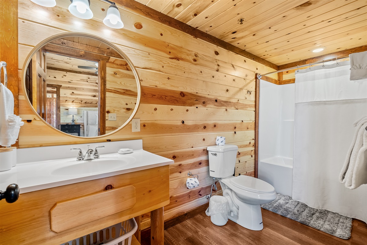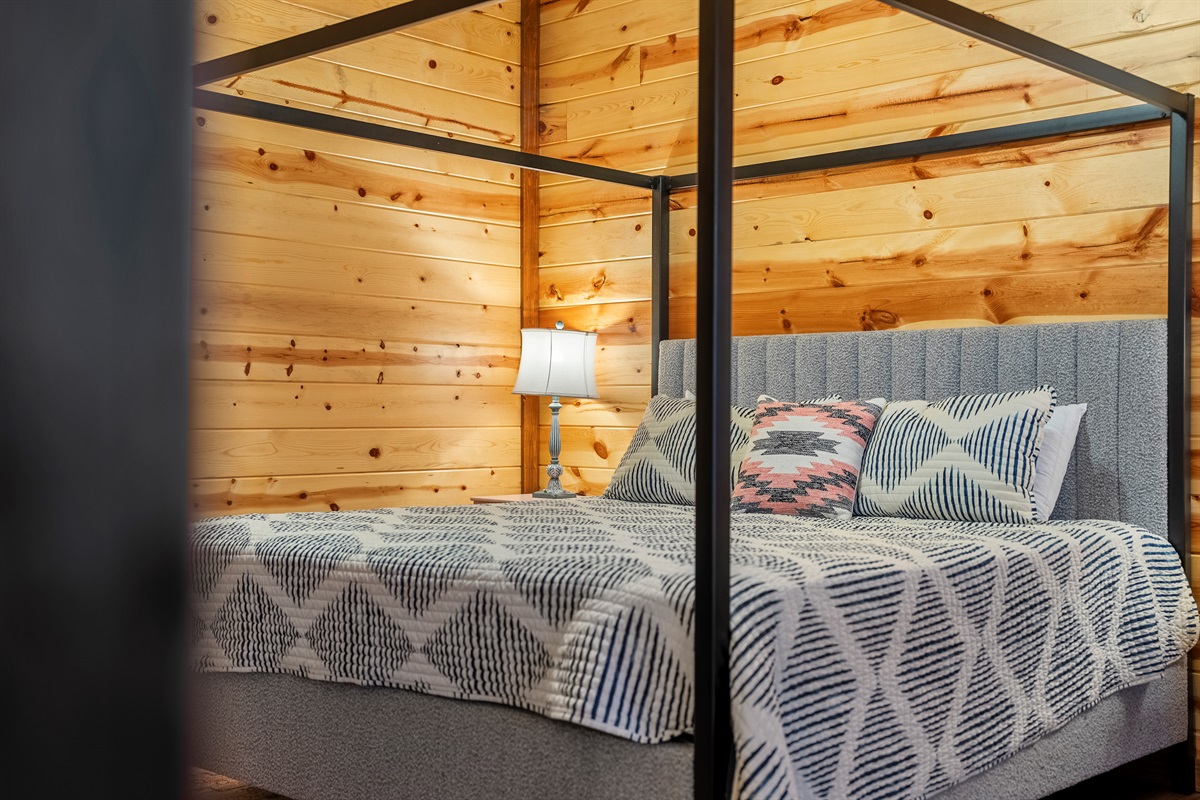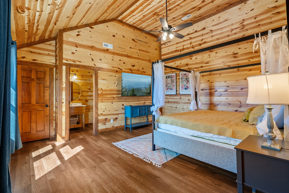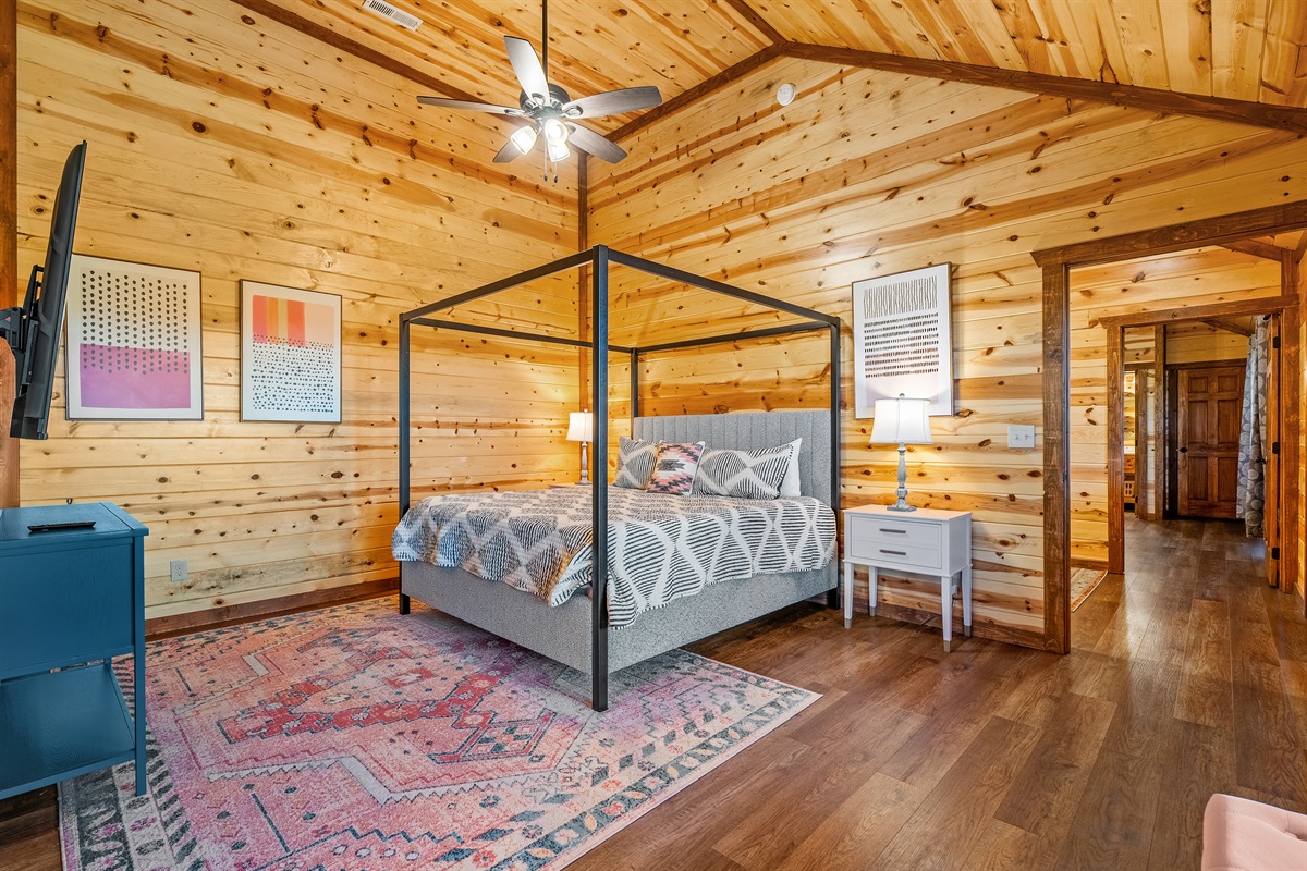 - King bedroom 2 is located on the main level and includes a king bed, ceiling fan, TV, and full ensuite bathroom.
