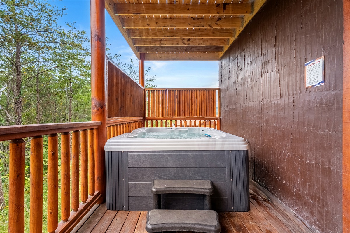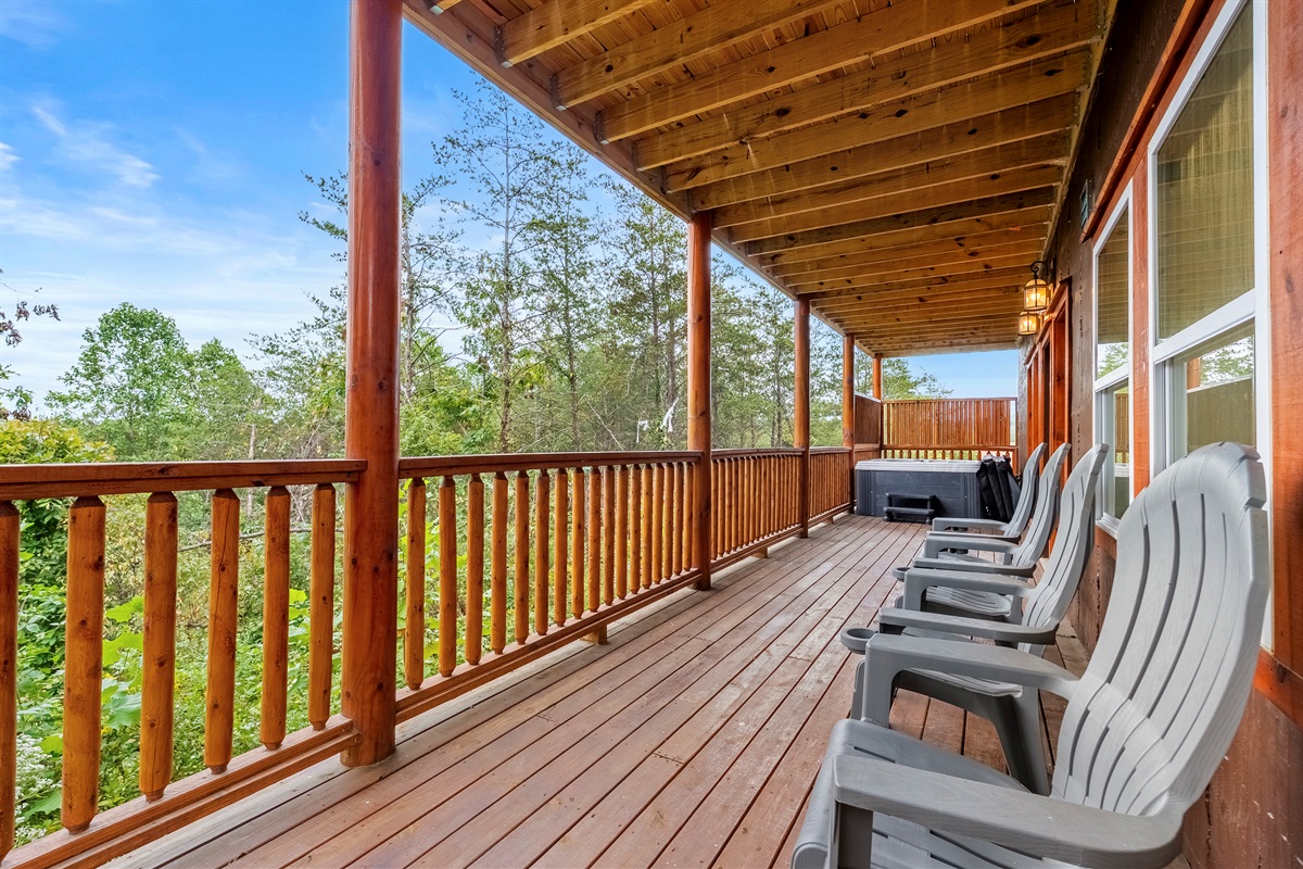 - Lower level large, fully covered back deck with hot tub and Adirondack chairs