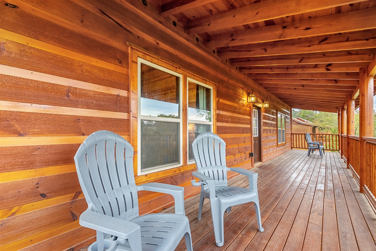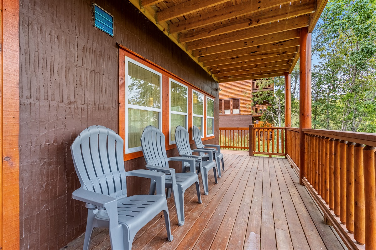 - Second story also features large, covered back deck and Adirondack chairs.