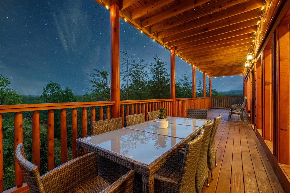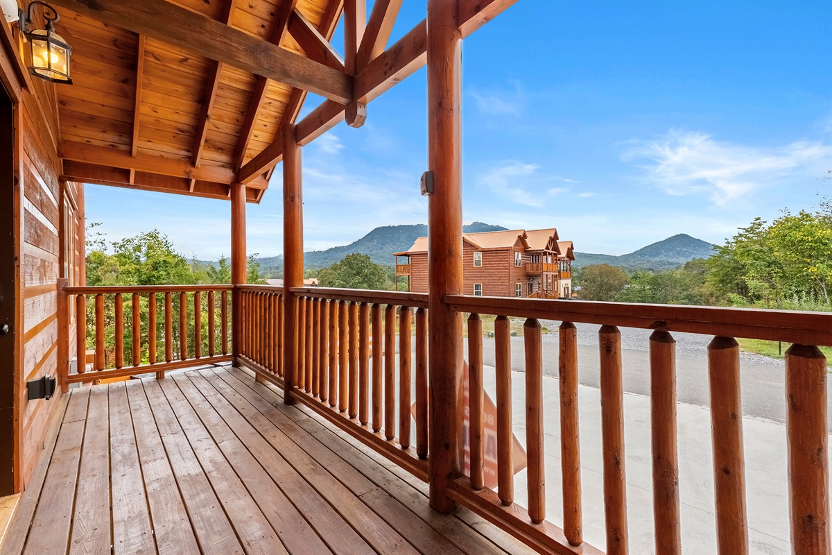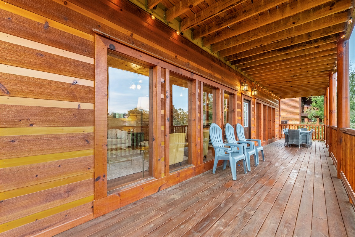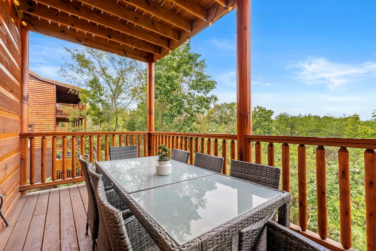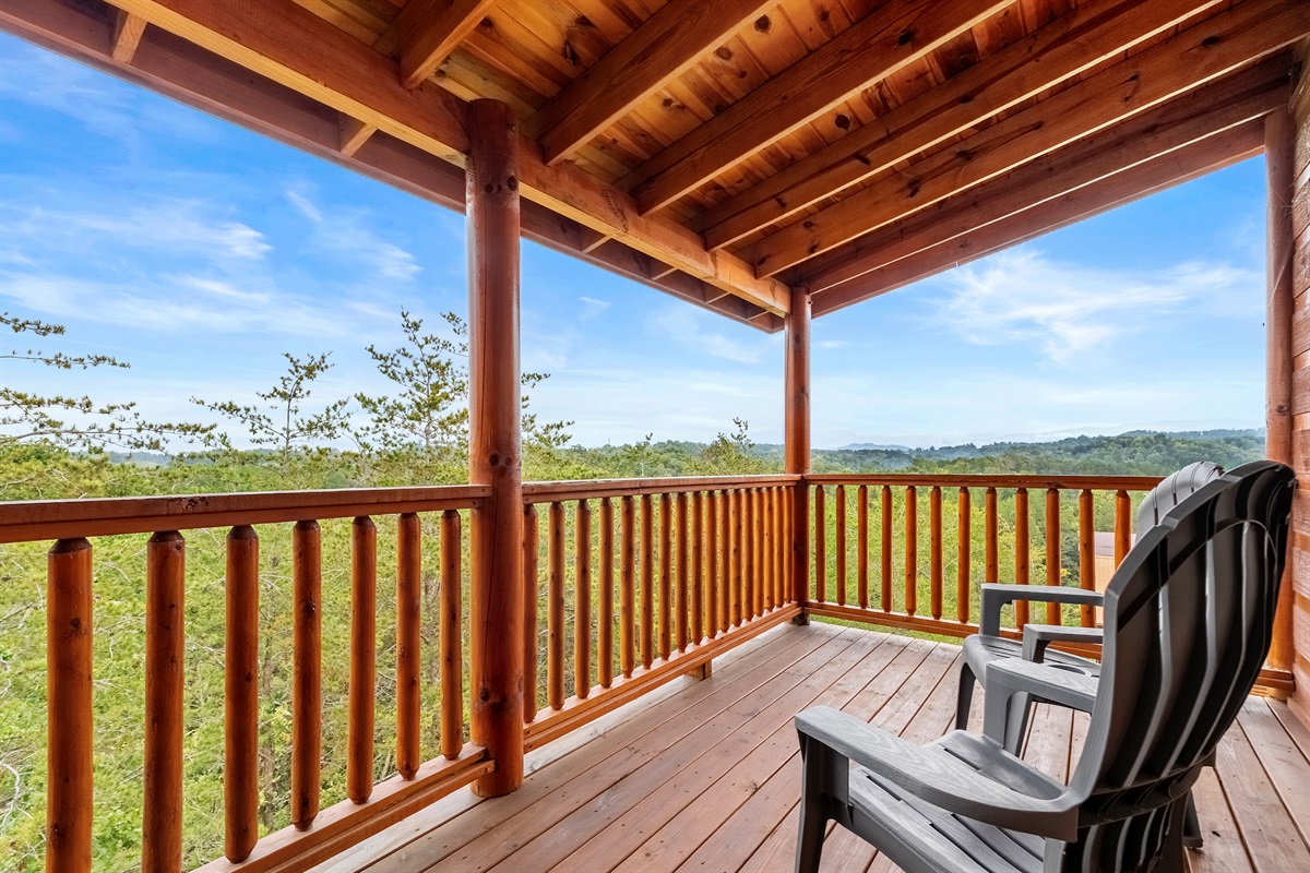 - Upstairs covered deck located off the living room overlooking the mountains with dining table and Adirondack chairs.