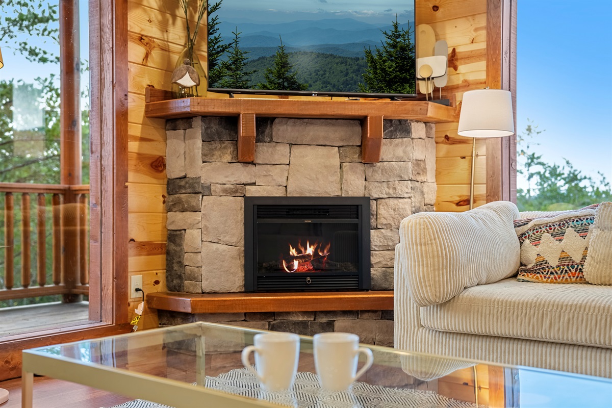 - Living room with indoor electric fireplace, large TV, and stunning mountain views.