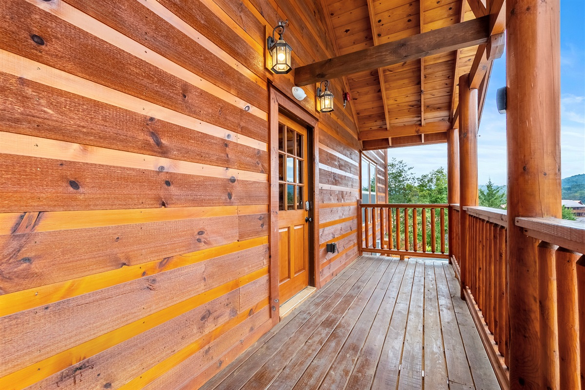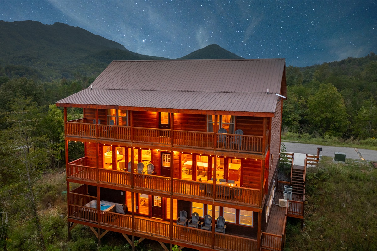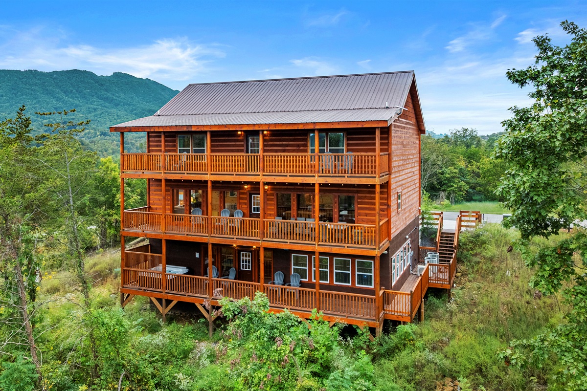 - Large back deck features three levels of mountain views with private hot tub, and outdoor dining, and Adirondack chairs.