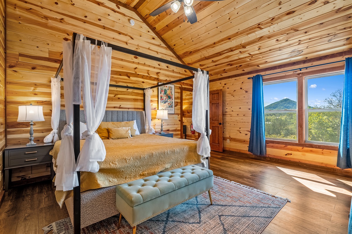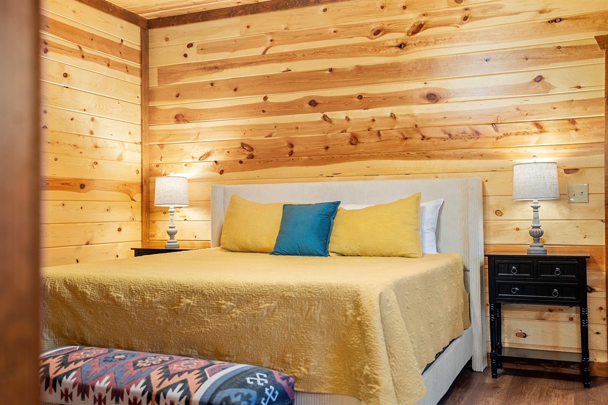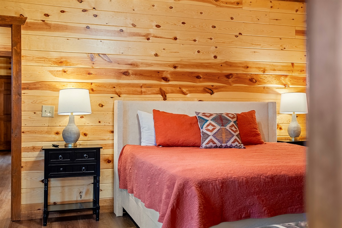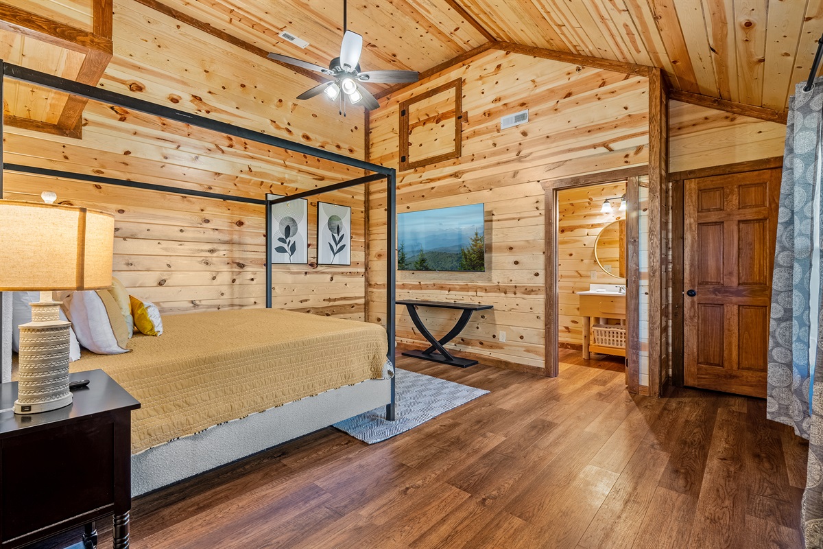 - King bedroom 1 is located on the main level and includes a king bed, ceiling fan, TV, and full ensuite bathroom.