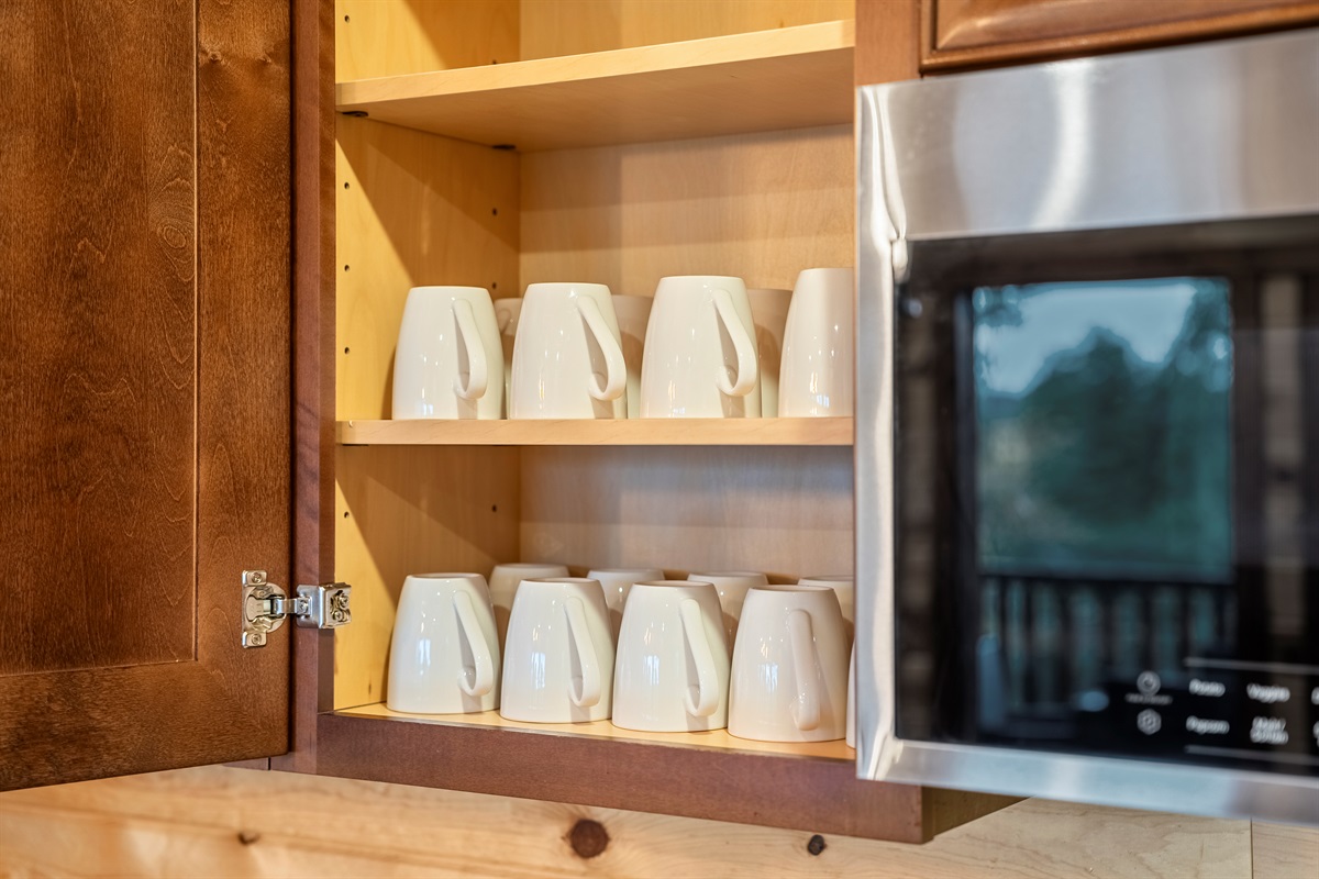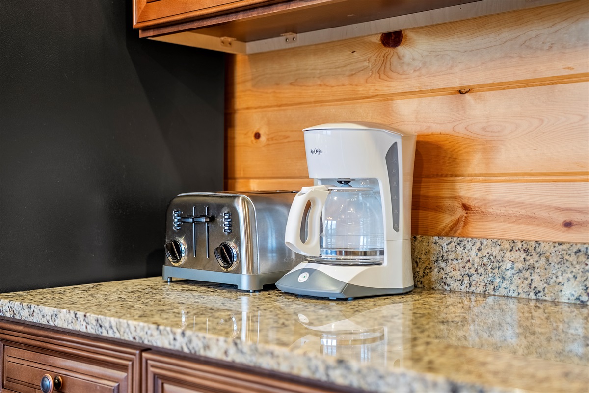 - Fully stocked coffee station with drip coffee pot, ground coffee, filters, and sweetener for the perfect cup of coffee to start off your morning.