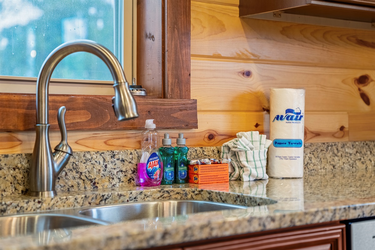 - Kitchen essentials: dish soap, dishwashing pods, paper towels, salt & pepper